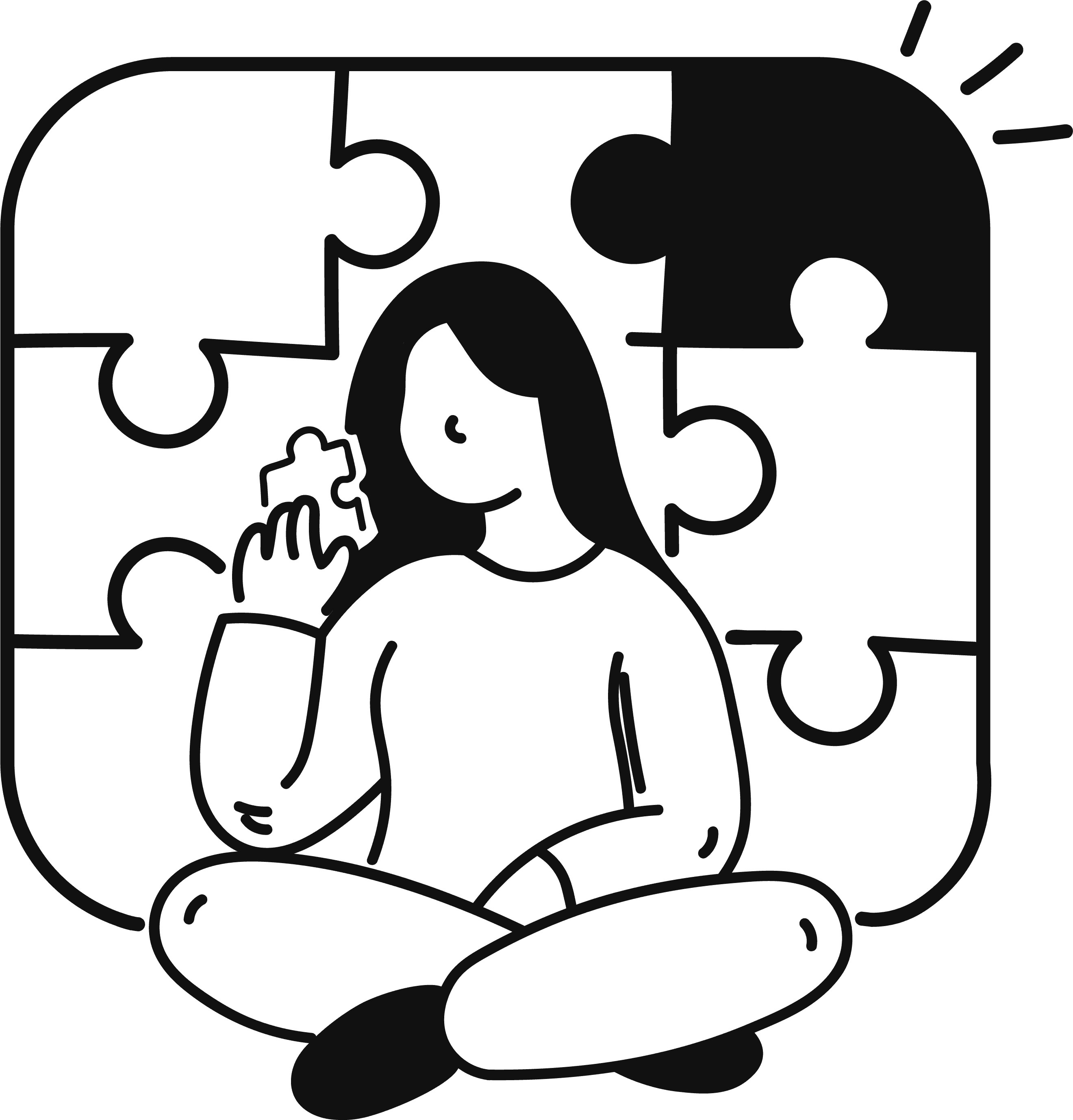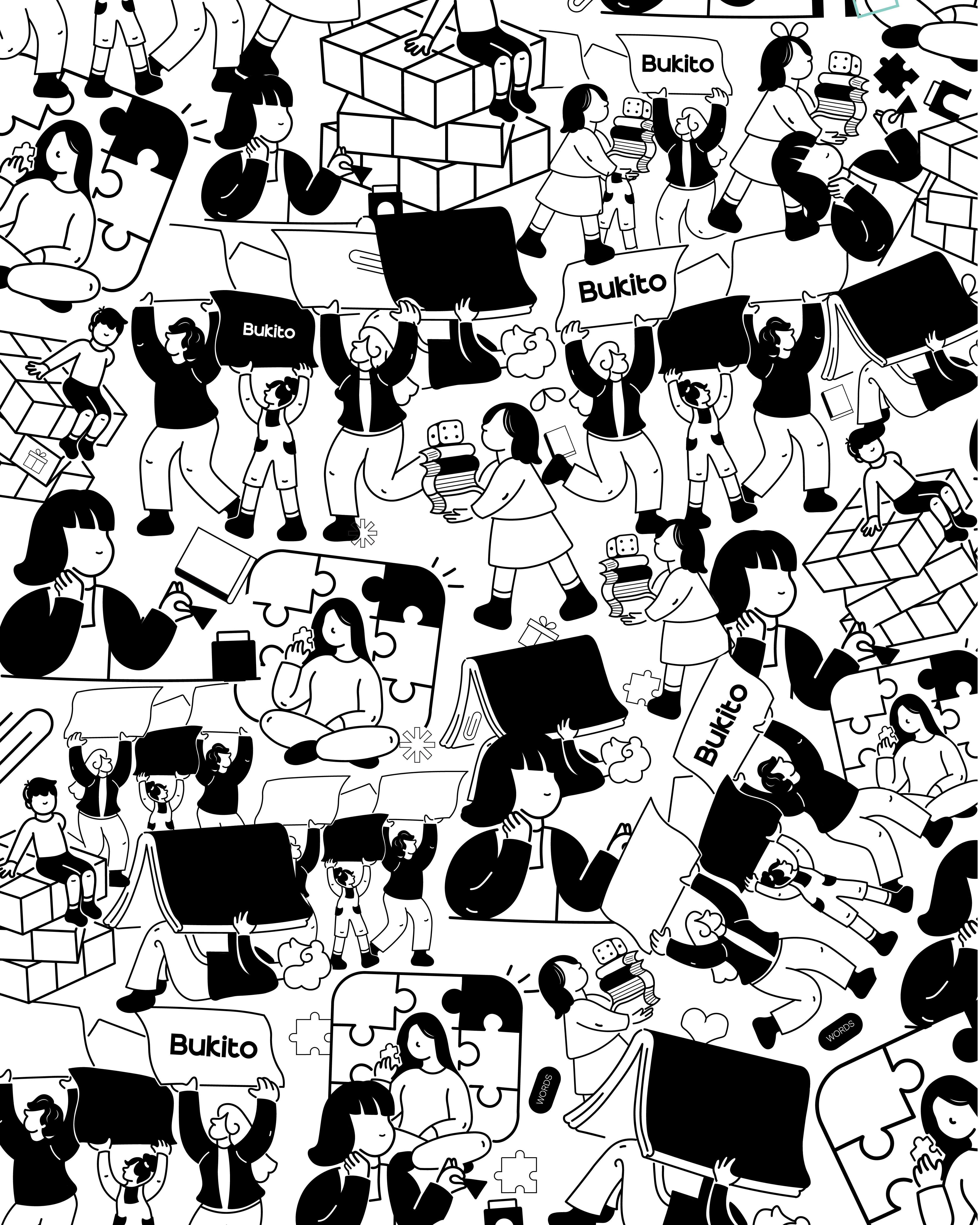 A soft teal palette, paired with bold black-and-white illustrations, creates an inviting visual world inspired by puzzles, grids, and story-driven moments.