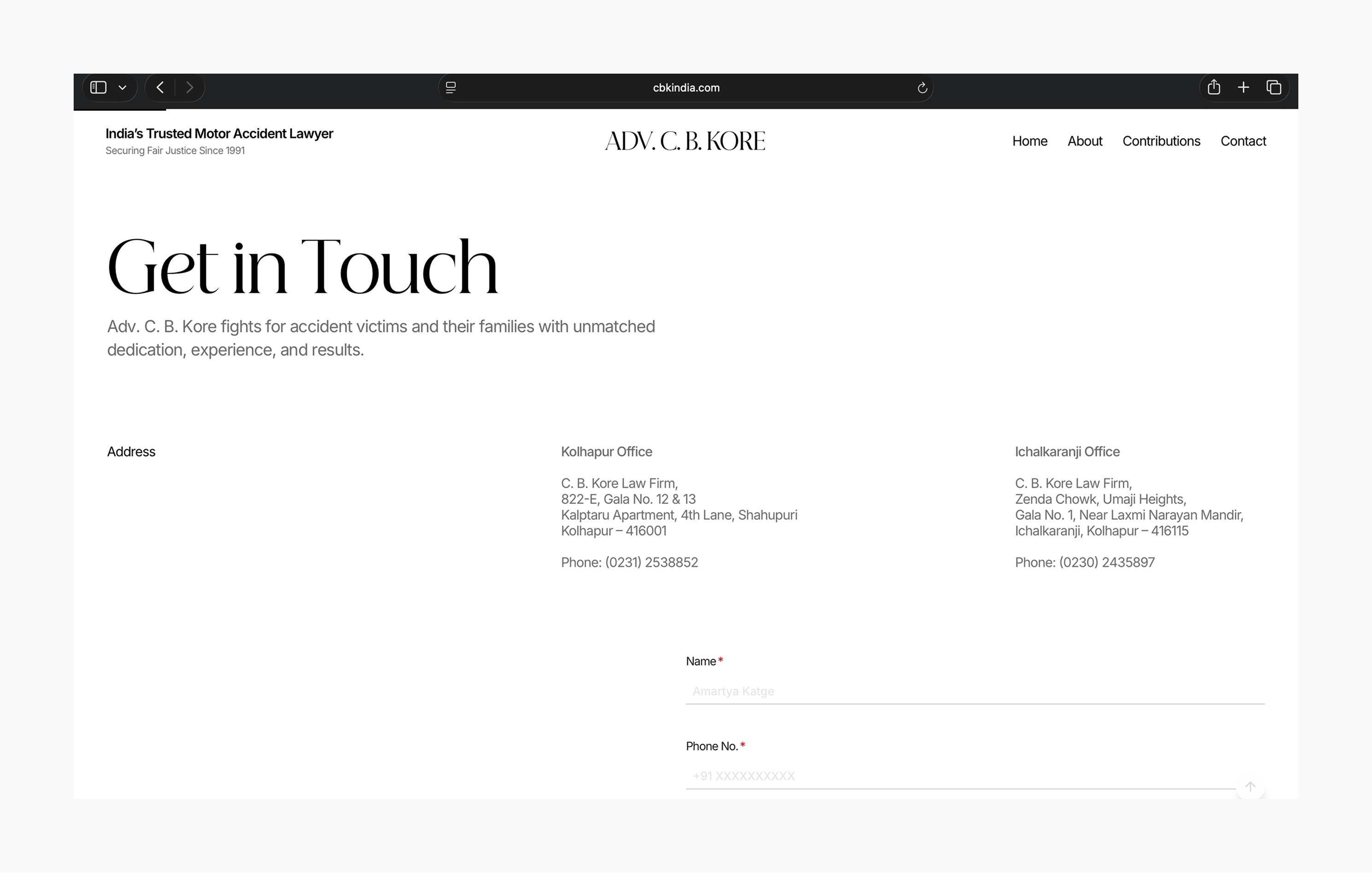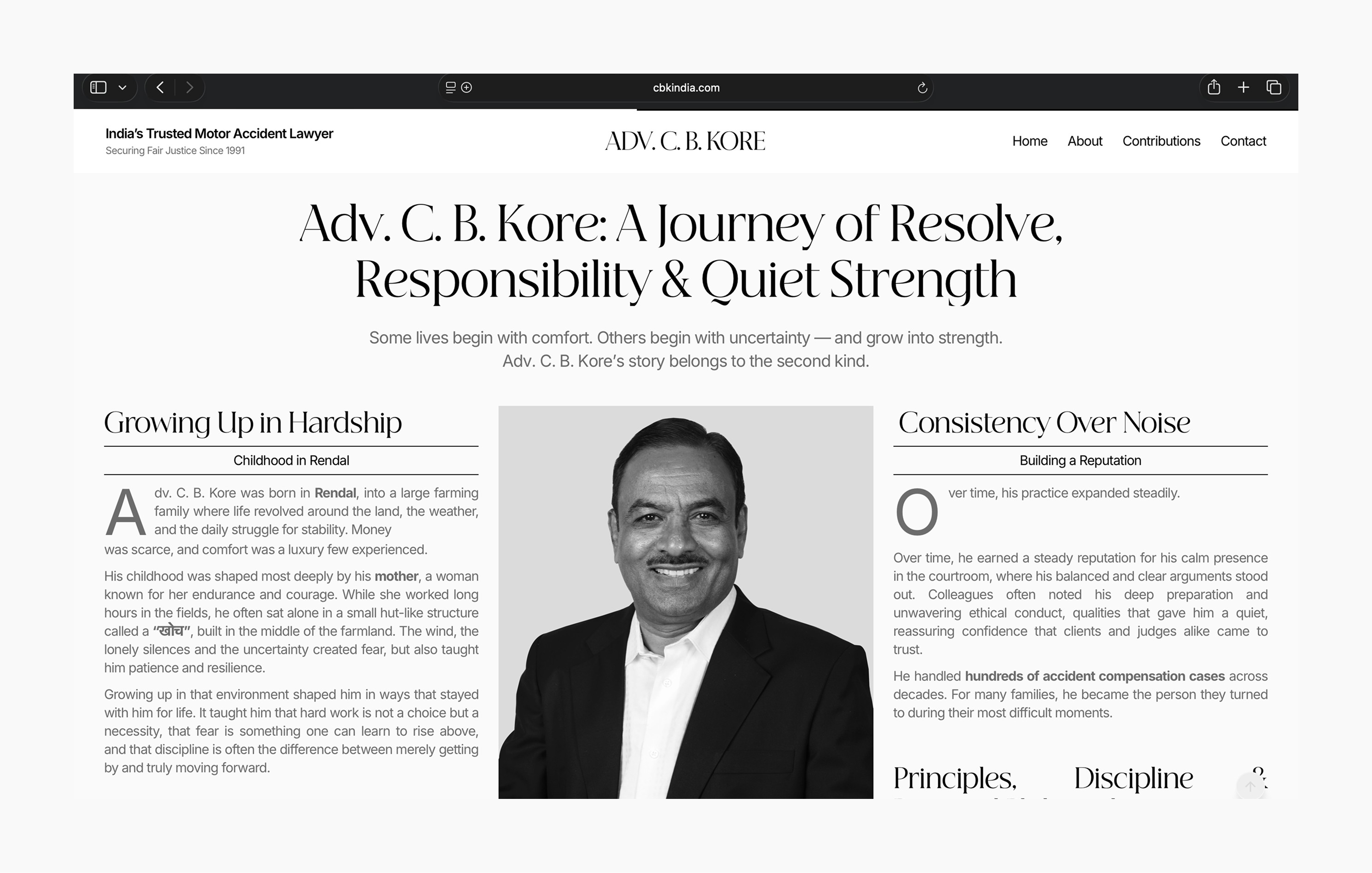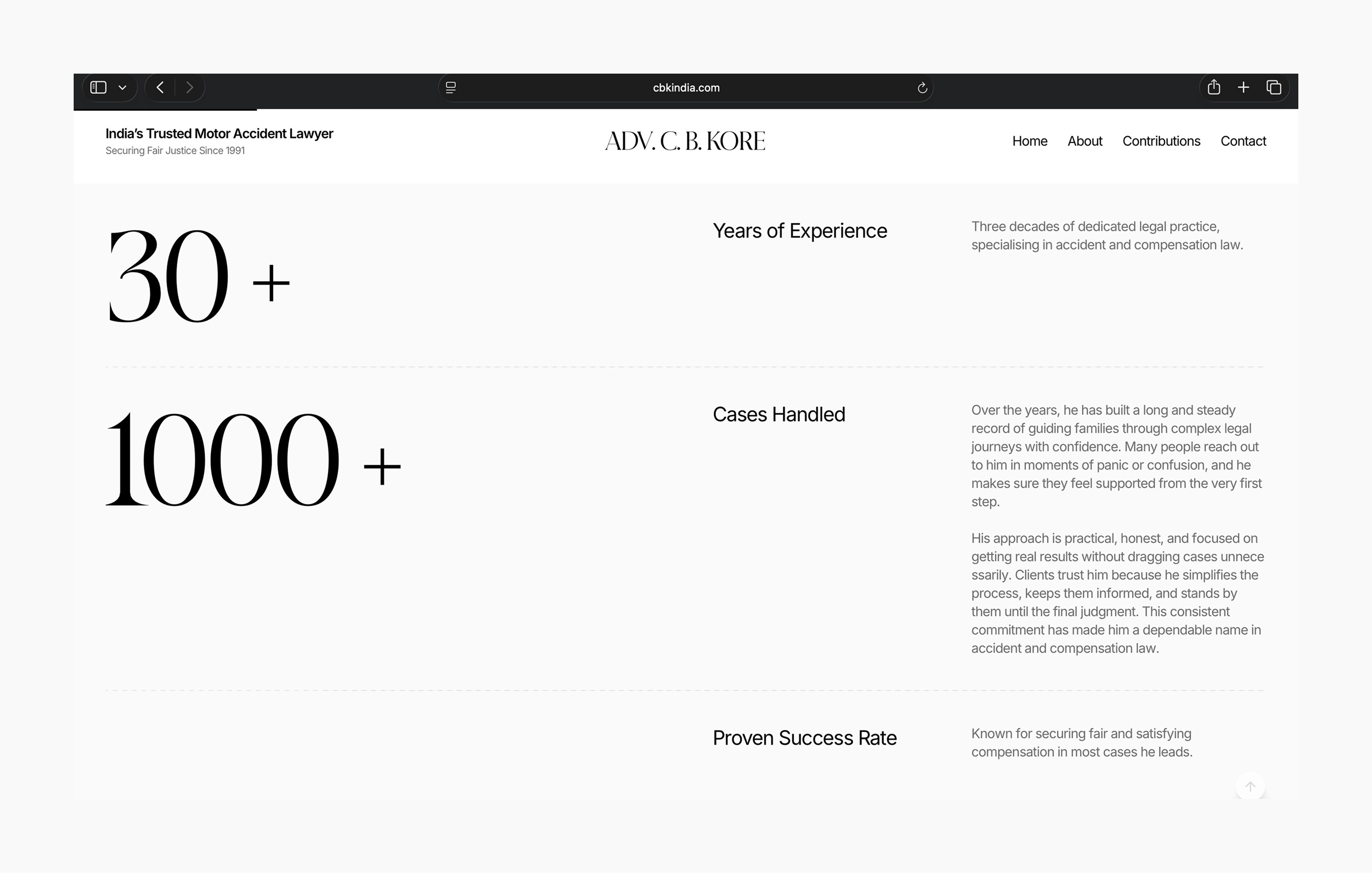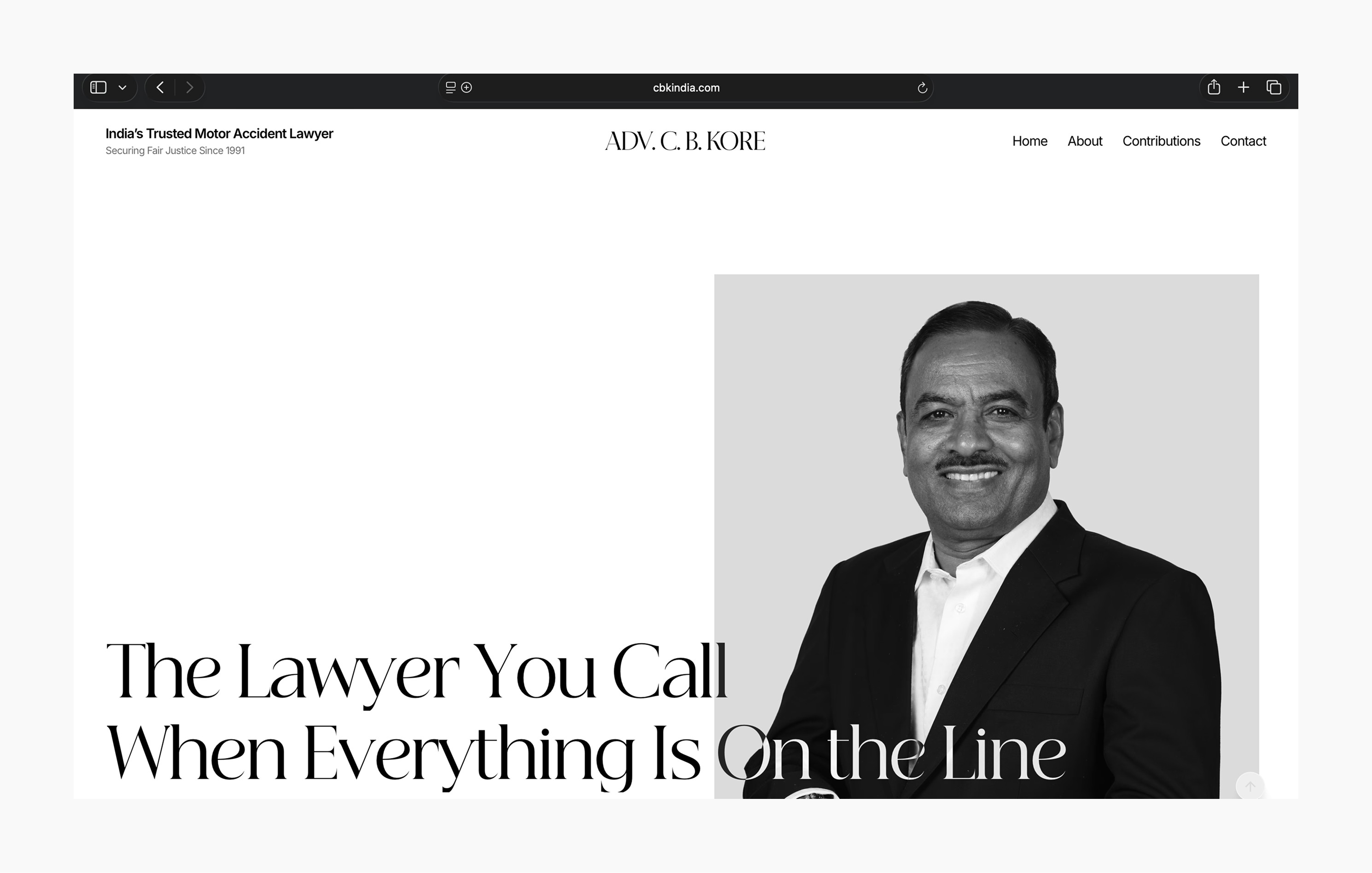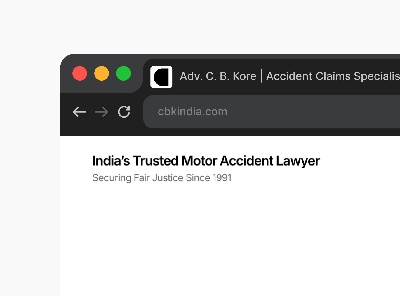 The website for Adv. C. B. Kore was designed to reflect three decades of legal practice defined by trust, consistency, and quiet strength. As one of India’s most respected motor accident and compensation lawyers, the digital experience needed to convey credibility without theatrics, authority without intimidation, and empathy without sentimentality.